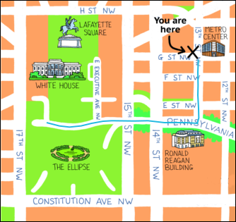 8 Look at the map of Washington DC. You are a tourist and you want to go to Ford's Theatre. You are in front of the White House. Ask for directions. Write the dialogue.