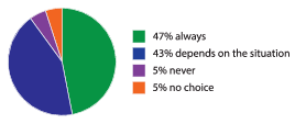 Personally, I'm surprised so many people always listen to music while they are working. I've always liked listening to music, but sometimes it's distracting. I don't think it's a good idea if you are trying to concentrate. So, I agree with the 43% who said 'It depends on the situation'. I've had a few jobs in shops and cafés where they played music – so that meant I didn't have any choice. And 5% never listen to music. I suppose they don't like music, or perhaps they think if there's music on, they won't be able to work at all?